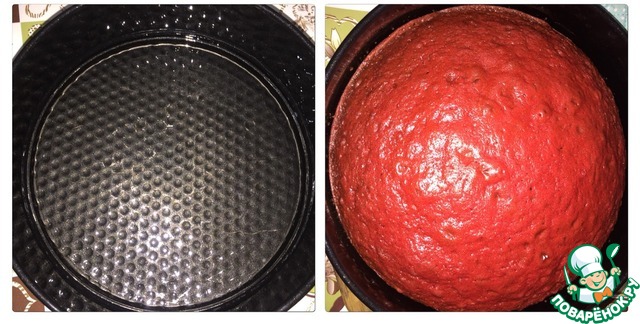 Смазываем форму маслом, и выложим лишь ПОЛОВИНУ порции густой красной массы. Ставим в духовку на 180С, у меня он выпекался 40-50мин. Готовность проверяем зубочисткой))) у меня на второй фотке уже готовый корж. После того, как испекся 1-ый корж, также печем и второй.