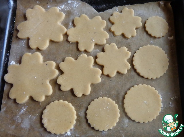 Тесто раскатать толщиной 4-5 мм и вырезать подходящие формочки. Выпекать при 170 градусах минут по 12 до легкой золотистости.