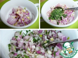 Лук нарезать небольшими кубиками и замариновать в смеси оливкого масла, уксуса и соли.