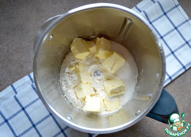 Приготовить тесто для основания пирога. В чашу блендера положить просеянную муку, сахар и охлажденное сливочное масло кусочками. Добавить семена из ванильного стручка. Для этого надрезать стручок вдоль и с помощью лезвия ножа провести по внутренней стороне стручка, собирая все семена. Сам стручок не выбрасываем! Его можно положить в банку с сахаром, закрыть банку крышкой и убрать на хранение. Таким образом у Вас получится сахар с ароматом ванили - ванильный сахар!