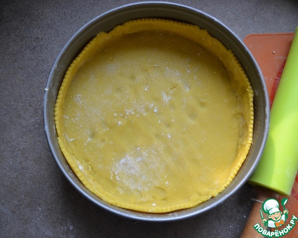 Духовку включить на 190 С. Подготовить разъемную форму (26 см), слегка смазать маслом и застелить пекарской бумагой. Тесто достать из холодильника и раскатать в пласт. Если с раскатыванием теста возникнут сложности, сделать это можно между двух листов пекарской бумаги. Осторожно перенести тесто в форму для выпечки. Сформировать бортик высотой 2-2,5 см, а излишки теста обрезать, подровнять край основания пирога.