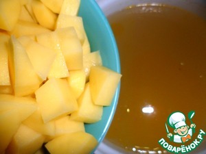 • В бульон выложить нарезанный на кубики картофель, варить после закипания на медленном огне до готовности.
