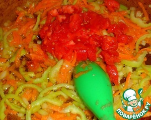 • Добавить к овощам нарезанные помидоры без шкурки. Тушить, помешивая, пару минут.
