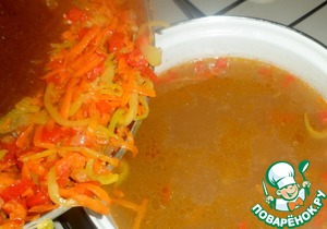 • Нарезать мелко лук, натереть морковь на терке, нарезать перец соломкой. Все по очереди добавлять в сковороду с разогретым маслом и обжарить.