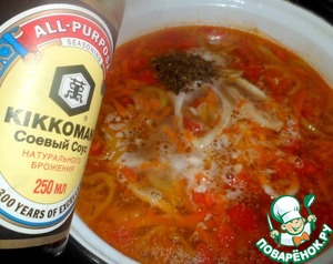 У Лоры (Хлоркина) увидела суп с кальмарами и так как я любитель всякой морской живности, решила узнать, что же это за чудо такое. От рецепта не отступала ни на шаг, включая способ приготовления кальмаров. Только соус Киккоман пришлось заменить более дешёвым Терияки, но всё равно мне очень понравился вкус блюда. Спасибо большое, Галочка, за рецепт! Он выверен идеально, чувствуются и кальмары, и лёгкая азиатская пикантность.