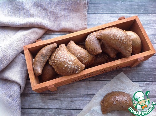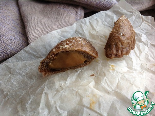 Поместить в центр каждого кружка ложку начинку. При желании к варёному сгущённому молоку можно добавить рубленые орехи. Сложить кружок пополам и аккуратно защипать края пальцами, затем придавить зубчиками вилки для большего уплотнения краев. Можно слегка смазать края яйцом.