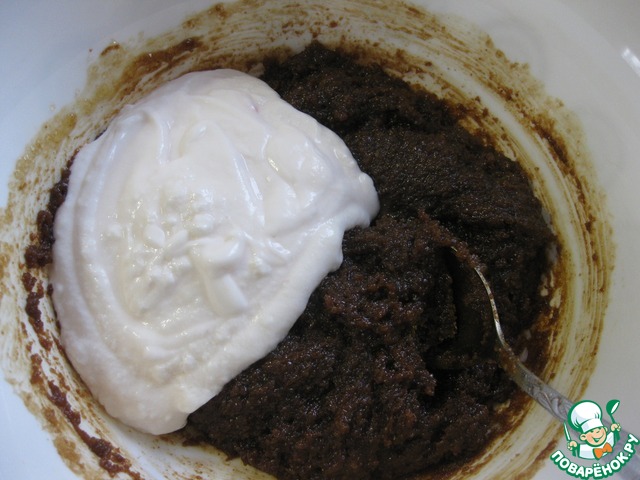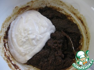 Добавляем йогурт,- у меня домашний, густой-, вы можете взять кефир, - перемешиваем