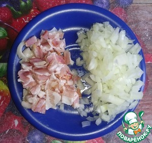 Мелко шинкуем лук, нарезаем бекон маленькими кусочками.