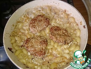Готовое мясо выкладываем на тарелку, рожки перекладываем в сковороду, добавляем лук с беконом, заливаем сливками, перемешиваем, доводим до кипения, выключаем огонь, кладем мясо и накрываем сковороду крышкой.
