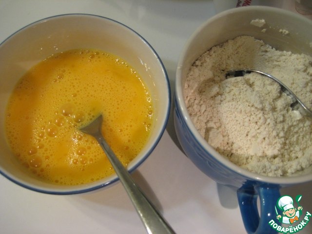 • Смешать каштановую муку с разрыхлителем, солью и корицей. Яйца взбить в чашке вилкой.