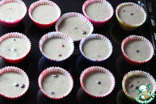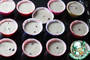 Тесто, еще раз хорошенько перемешав, чтобы шоколад и клюква были во всей массе, разливаем по формочкам, заполняя их на три четверти или чуть больше...
