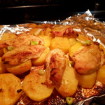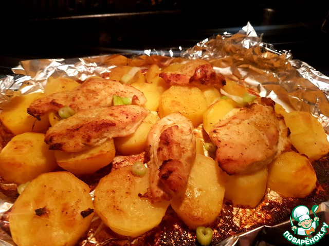 Выкладываем картошку на противень и хорошо от души посыпаем фенхелем (он придает изумительный аромат и вкус всему блюду). Сверху выкладываем кусочки курицы и поливаем маринадом. Запекать в духовке при 180 градусах 35-40 минут.