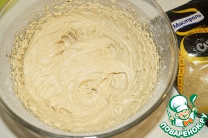 • Приготовить крем. Для этого сливки взбить до пышности и устойчивости, при необходимости воспользоваться загустителем. Сахар Демерара смолоть в пудру. Добавить творожный сыр, пудру и кофе (предварительно растворить кофе в теплых сливках). Взбить миксером пару минут до соединения масс.
