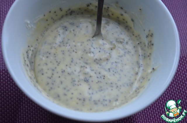 Для соуса : оставшеюся сметану, мак, миндаль (миндаль можно перемолоть), мед перемешать.
