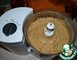 Добавить мёд, сахар, сливки, растительное масло, муку и соду, погашенную яблочным уксусом. Смешать в блендере на средней скорости. Получится вот такое тесто, приятного цвета «сливочных ирисок».