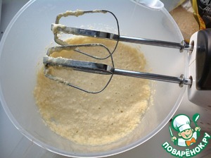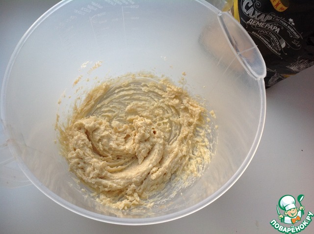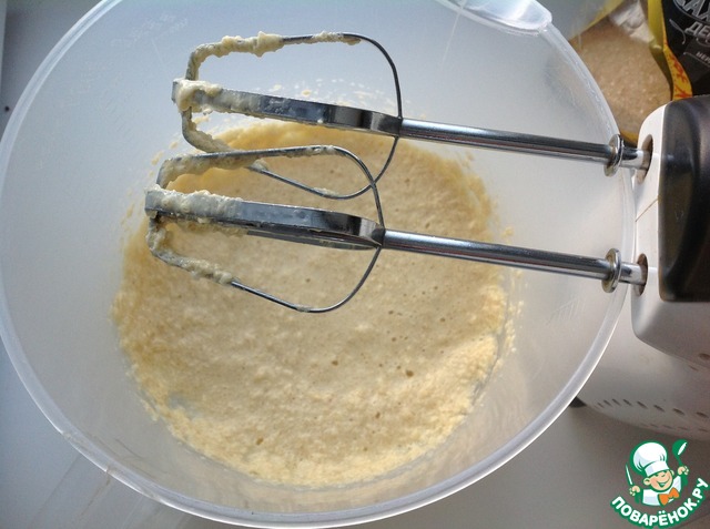 Добавить яйцо, продолжая взбивать. Затем добавить тёплое молоко и еще раз взбить. Собрать масло со стенок чаши.