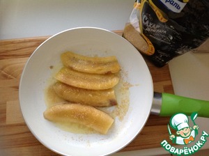 В сковороде разогреть сливочное масло и обжарить очищенные и разрезанные бананы. Затем добавить тростниковый сахар, продолжая жарить на сковороде до карамельного вкуса. Огонь выключить и отставить в сторону.