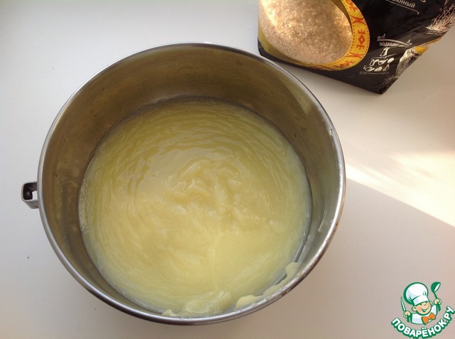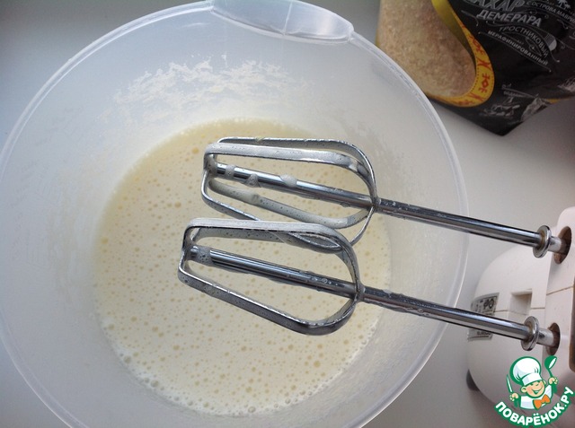 В чашу миксера добавить яйца, сахар и взбить в пышную массу.