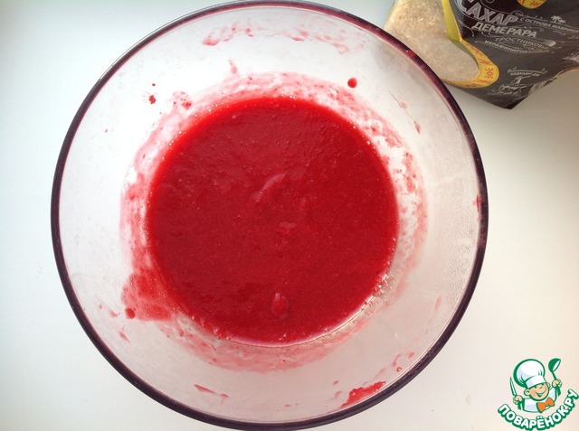 Далее приготовить малиновый соус. Для этого замороженную малину предварительно разморозить, растолочь толкушкой и протереть через сито для удаления косточек. Смешать с сахаром. Вот эту процедуру я советую поручить супругу, чтобы не скучно было смотреть телевизор.
