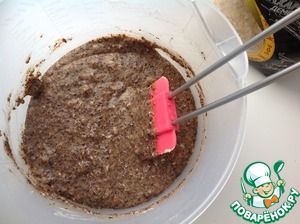 Добавить размягченное масло, размолотые в муку орехи, тертый шоколад, перемешать. Затем добавить муку и разрыхлитель.
