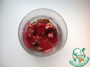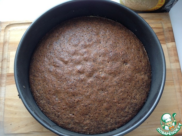Разъёмную форму смазать маслом и присыпать мукой. Выложить тесто в форму и выпечь при 180 градусов до готовности. Остудить. Нарезать на квадратики. Размер моей формы - 20 см. Я разрезала корж вдоль на 2 части, а затем на кусочки. Крошки не выбрасывать, они пойдут на украшение десерта.