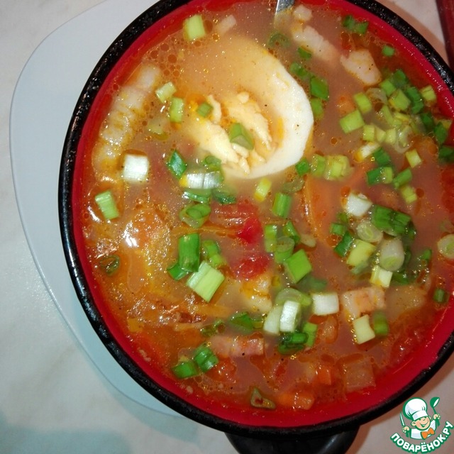 Разлить по тарелкам, добавить нарезанное яйцо и мелко нарезанный зеленый лук. По желанию добавить сметану или майонез..