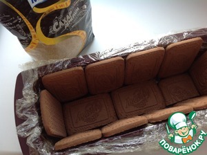 Форму застелить пергаментом. Выложить снизу и по бокам формы печенье.
