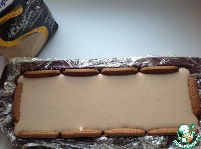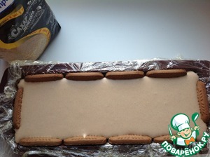 Вылить половину кремовой смеси в форму, разровнять. Выложить слой печенья, сверху - оставшийся крем. Затянуть форму пищевой пленкой и убрать в морозильник на ночь.