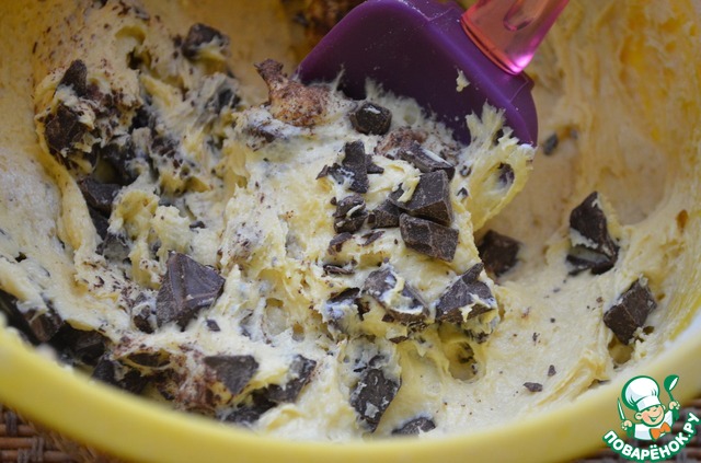 Шоколад порубить ножом на мелкие кусочки, добавить в тесто и тщательно перемешать, чтобы распределить по тесту равномерно