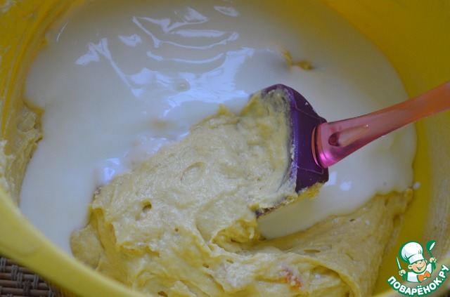 Не прекращая взбивать, по одному добавить яйца, чередуя с мукой