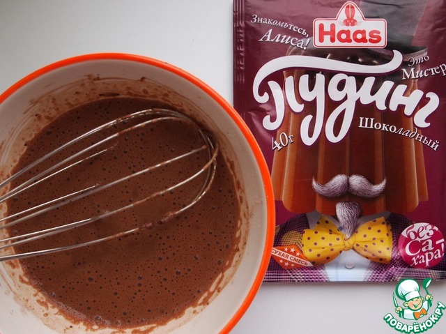 Далее приготовить пудинг. Соединить содержимое пакетика со 100 мл. молока и 3-4 ст. л. сахара. Тщательно перемешать до исчезновения комочков. Оставшееся молоко довести до кипения. Снять с огня и при постоянном помешивании влить в молоко приготовленную смесь. Полученную смесь довести до кипения и варить в течение одной минуты.