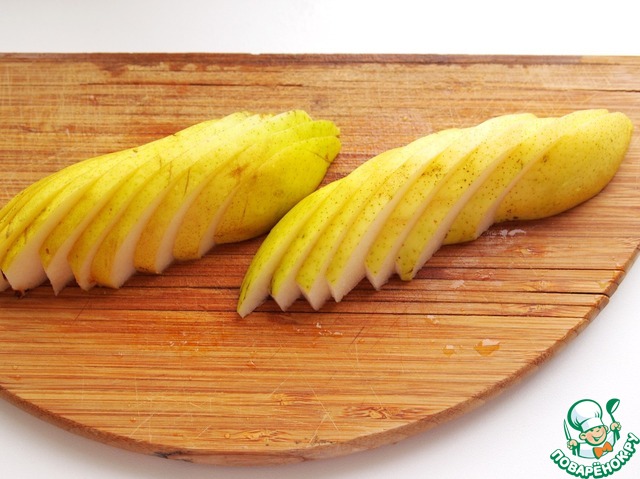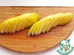 Пока застывает пудинг, займемся грушами. Груши хорошо помыть, отрезать хвостики. Нарезать дольками.