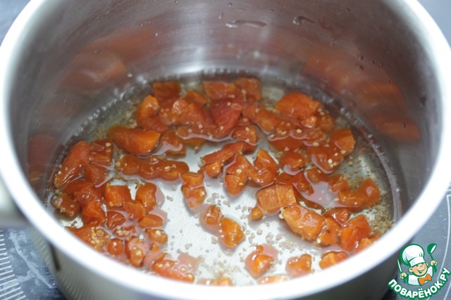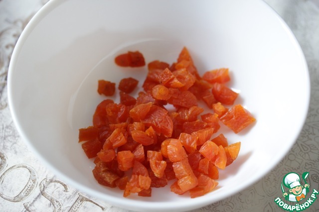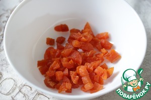 Курагу вымыть, обсушить и нарезать на кусочки.