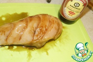 На курином филе сделать надрезы, но не до конца, натереть чесноком, растительным маслом и соевым соусом.