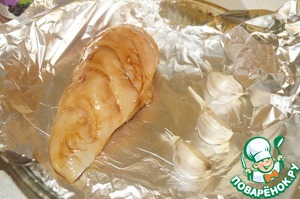 Выложить филе в жаропрочную форму, застеленную фольгой. Рядом выложить дольки чеснока. Накрыть краями фольги куриное филе и дольки чеснока. Запечь в разогретой до 180 градусов духовке, около 20-25 минут.