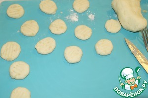 Сформировать из картофельного теста колбаску диаметром 2-3 см и нарезать тонкими кружочками.