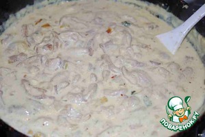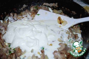 Уменьшаем огонь до чуть меньше среднего. Добавляем сметану, соль и перец. Мешаем. Даем сметане закипеть и кипятим буквально 5 минут.