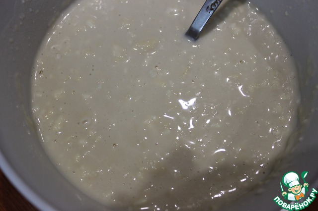 Заводим опару. В 200 мл приятно теплого молока распускаем дрожжи, 1 ч. ложку сахара и 100 грамм муки. Все размешиваем и ставим в теплое место.