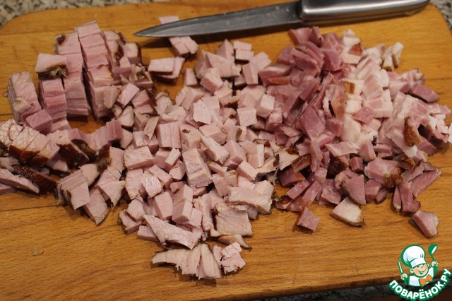 Нарезаем копчености кубиком и отправляем на горячую, смазанную растительным маслом сковороду. Когда жир вытопится, добавляем нарезанный полукольцами или четверть кольцами репчатый лук. Жарить до мягкости лука. Остудить до чуть теплого состояния.