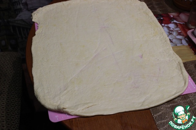Я раскатываю тесто силиконовой скалкой на силиконовом коврике. Это позволяет не забивать тесто лишней мукой и стол гораздо чище. Тесто раскатать по размеру противня + 2-3 см по бокам на бортики.