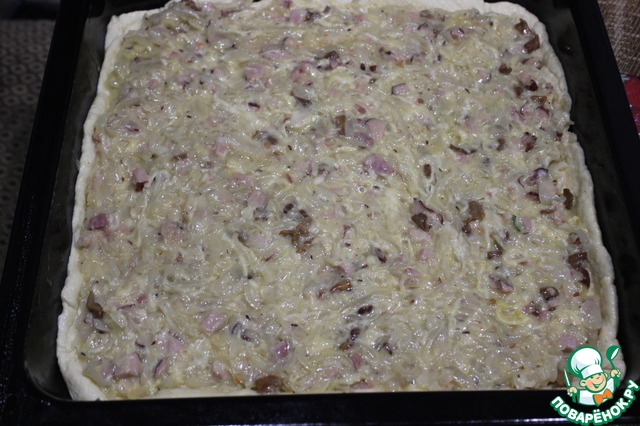 Раскатанное тесто перенести на смазанный растительным маслом противень. Выложить ровным слоем начинку. Слегка смазать бортики остатками сметаны из стаканчика. Поставить в теплое место минут на 20 на расстойку.