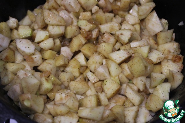 Яблоки почистить, вырезать середину и порезать крупными кусочками. Потушить их помешивая в сливочном масле с корицей и сахаром. Они должны стать чуть-чуть мягкие. До каши состояние доводить не желательно. Дать начинке остыть.