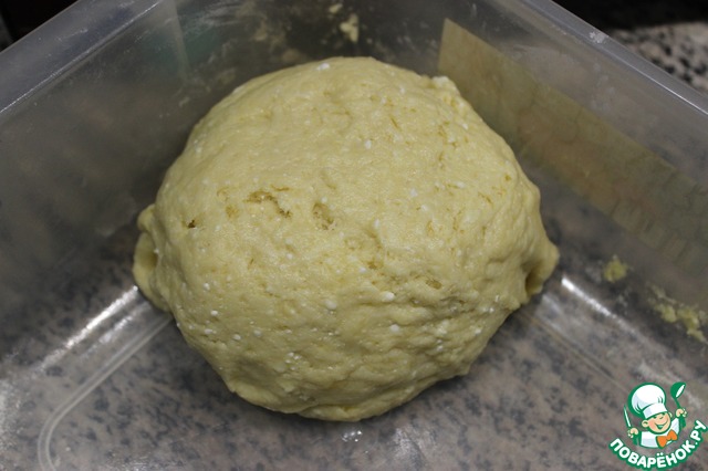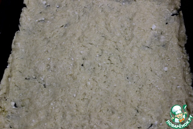 Руками разровнять тесто на смазанном маслом противне ровным слоем.