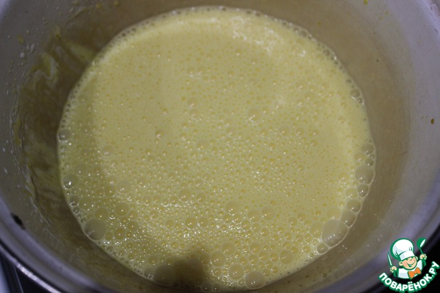 Готовим заливку. Делим яйца на желтки и белки. В белках не должно быть частиц желтка. Растираем желтки с сахаром, подмешиваем сметану. Все вместе взбиваем.