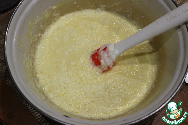 Белки аккуратно смешать со сметанной смесью лопаточкой движениями вверх-вниз. Это действие нужно выполнить к окончанию 20 минут выпечки ватрушки.