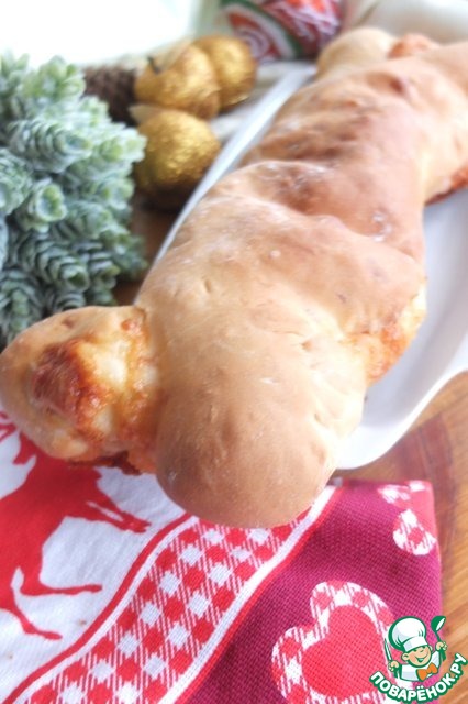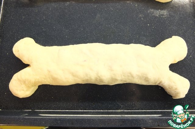 С каждой стороны рулета делаем глубокий (5-7 см) надрез, каждую из двух надрезанных половинок заворачиваем вниз и в сторону, формируя косточку.