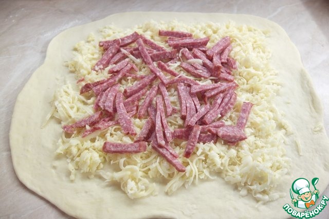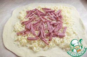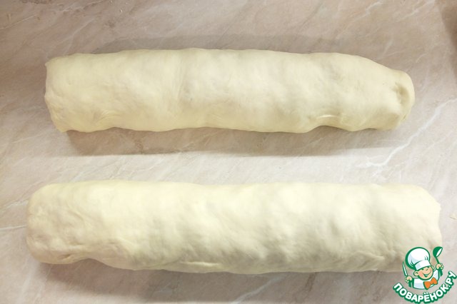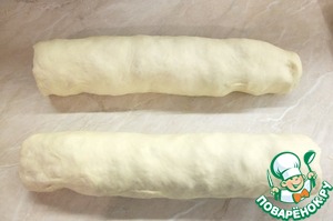 Сворачиваем тесто плотным рулетом, я делала из целой части теста и просто разрезала длинный рулет пополам.