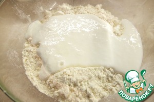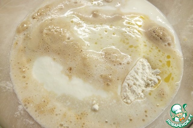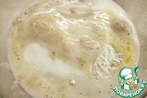 Добавляем опару, остывшее растопленное сливочное масло.