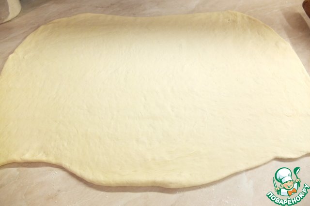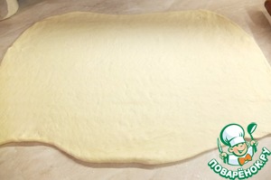 Раскатываем в тонкий прямоугольный пласт, шириной примерно 0,5 см.