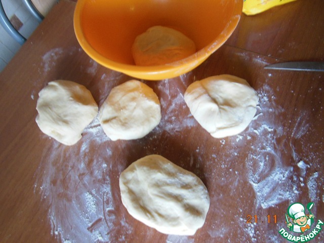 • Затем делим тесто на 4-5 частей. Можно поделить тесто и на 6-7 частей. Рогалики будут поменьше, но не крошечными.